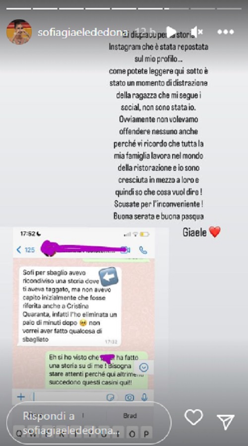 Un utente ha condiviso su Twitter una foto pubblicata dalla De Donà in cui quest’ultima si trova nella sua lussuosa suite stesa sul letto a mangiare una pizza, aggiungendo la seguente didascalia: “C40 può solo sparecchiare”, chiaro riferimento a Cristina Quaranta e al fatto che fa la cameriera. Giaele si è resa protagonista di uno scivolone postando in una Instagram story proprio il post “incriminato”. In seguito, la De Donà ha chiarito la questione: “Mi dispiace per la storia Instagram che è stata repostata sul mio profilo. Come potete leggere qui sotto è stato un momento di distrazione della ragazza che mi segue i social, non sono stata io. Ovviamente non volevamo offfendere nessuno, anche perché vi ricordo che tutta la mia famiglia lavora nel mondo della ristorazione e io sono cresciuta in mezzo a loro, quindi so coisa vuol dire! Scusate per l’inconveniente”.