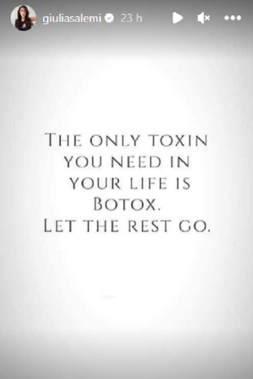 Giulia Salemi, invece, ha aggiunto una story su Instagram che potrebbe riferirsi a quanto sta accadendo. Ieri pomeriggio, mentre rientrava in Italia dalla California, ha scritto: "The only toxic you need in your life is botox, let the rest go", tradotto in italiano "L'unico elemento tossico di cui hai bisogno nella tua vita è il botox, lascia andare il resto". Non è chiaro se "l'elemento tossico", in questo caso, sia il gossip o il suo fidanzato Pierpaolo Pretelli.
