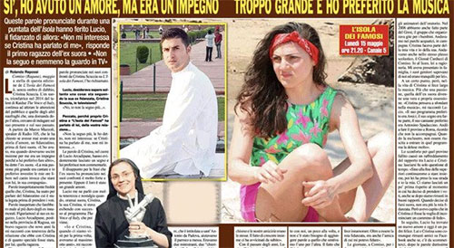 Il suo nome è Lucio Arcadipane. Contattato dalla rivista diretta da Osvaldo Orlandini, l’ex fidanzato della naufraga non si è sbottonato molto: “Non la seguo più, non mi interessa se ha parlato di me", ha detto, mettendo così un punto definitivo ad una storia sulla quale non ha più alcuna intenzione di pronunciarsi. Ai tempi di The Voice of Italy, come riportato dal settimanale, Arcadipane aveva speso molte più parole sul conto della fidanzata: “Avevamo otto anni quando ci siamo visti per la prima volta. Siamo cresciuti insieme. Era la mia fidanzata e l’amica di cui mi potevo fidare. Mi presentò ai genitori e loro erano tranquilli per lei. Quando però la passione per la musica ha preso il sopravvento il rapporto si è incrinato. Cristina pensava a sfondare nel mondo della musica. Andò a Roma a fare i provini per Amici di Maria De Filippi, ricordo che non la accompagnai. La esclusero e non essere riuscita a entrare in quel programma la deluse molto”.