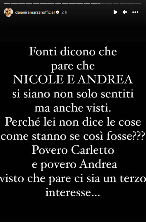 Stando ad una segnalazione giunta a Deianira Marzano, la Santinelli e Andrea Foriglio non si sarebbero solo sentiti, ma anche visti: “Fonti dicono che pare che Nicole e Andrea si siano non solo sentiti ma anche visti. Perché lei non dice le cose come stanno se così fosse? Povero Carletto e povero Andrea, visto che pare ci sia un terzo interesse”.