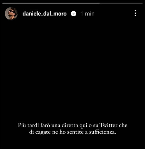 Pensavate fosse finita qui? Assolutamente no. Pochissimi istanti fa, Daniele Dal Moro ha pubblicato una nuova story su Instagram (per poi rimuoverla nuovamente dopo pochi secondi), nella quale ha scritto: “Dopo farò una diretta qui o su Twitter, che di cag*te ne ho sentite a sufficienza”. Non ci resta che attendere il nuovo capitolo dell’Oriele-drama.