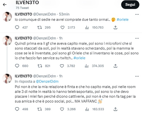 Nel suo sfogo su Twitter, l’ex tronista ha tirato fuori, tra le altre cose, il Van-gate: “Quindi prima era il GF che aveva capito male. Poi sono i microfoni che si sono staccati da soli. Poi in realtà stava scherzando. Poi la mamma le cose se le è inventate. Poi sono gli Oriele che si sono inventati le cose. Poi sono io che faccio i fan service su Twitch.