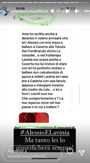 Proprio a in merito alle “famose” serate in discoteca di Corvino, che durante la loro conoscenza nel dating show erano spesso motivo di discussione, è giunta ad Amedeo Venza una segnalazione: “Ieri Alessio era a ballare a Caserta alla Tenuta San Ferdinando vicino la consolle… E nel frattempo Lavinia era scesa anche a Caserta, ma lui invece di stare con lei ha preferito andare a ballare non calcolandola di pezza. E infatti Lavinia ieri sera era a Caserta con una faccia appesa a mangiare insieme alla madre”.