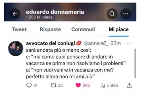 Poco dopo, Edoardo ha meso like ad un tweet di un utente che ha scritto: “Sarà andata più o meno così: