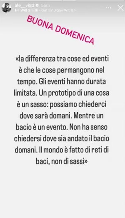 L’ex cavaliere salernitano ha postato una storia alquanto sibillina sul suo account Instagram, facendo insospettire e non poco i fan: “La differenza tra cose ed eventi è che le cose permangono nel tempo. Gli eventi hanno una durata limitata. Un prototipo di una cosa è un sasso: possiamo chiederci dove sarò domani. Mentre un bacio è un evento. Non ha senso chiedersi dove sia andato il bacio domani. Il mondo è fatto di reti di baci, non di sassi”.