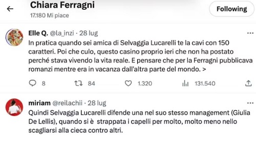 Secondo molti, una tirata d’orecchie decisamente soft per quelli che sono i canoni della giudice di Ballando con le Stelle. “Quindi sei Selvaggia Lucarelli e attacchi i Ferragnez e chiunque altro sulla qualunque e anche pesantemente – si legge su Twitter -. Poi però tocca a Giulia De Lellis e, facendo parte della tua stessa agenzia, le dai solo della povera ignorante che non sapeva. I giornalisti seri proprio”. E ancora: “In pratica quando sei amica di Selvaggia Lucarelli te la cavi con 150 caratteri. Poi che c*lo, questo casino proprio ieri che non ha postato perché stava vivendo la vita reale. E pensare che per la Ferragni pubblicava romanzi mentre era in vacanza dall’altra parte del mondo”.