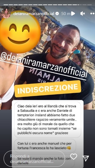Ecco quanto riportato dall’utente: “Ciao Deia, ieri sono andata al Lilandà che si trova a Sabaudia, e c’era anche Daniele di Temptation Island. Abbiamo fatto due chiacchiere, ragazzo veramente umile. Era molto giù di morale, da quello che ho capito non sono tornati insieme. Con lui c’era anche Manuel, che per fortuna Francesca ha lasciato”.