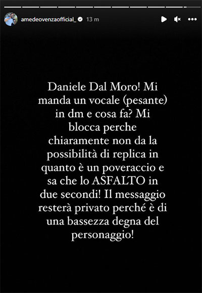 Nel frattempo Dal Moro, che ha reso privato il suo profilo Instagram, avrebbe inviato un messaggio vocale dai toni piuttosto accesi ad Amedeo Venza, influencer ed esperto di gossip, per poi bloccarlo. A rivelarlo è lo stesso Venza in una storia su Instagram: “Daniele Dal Moro! Mi manda un vocale (pesante) in dm e cosa fa? Mi blocca perché chiaramente non dà la possibilità di replica in quanto è un poveraccio e sa che lo asfalto in due secondi! Il messaggio resterà privato perché è di una bassezza degna del personaggio!”.