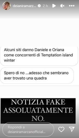 Un’indiscrezione che, però, non sembra trovare alcun tipo di conferma, anzi, è stata prontamente smentita da Deianira Marzano: “Notizia fake, assolutamente no”, ha scritto in una storia su Instagram l’esperta di gossip. Dunque, almeno per il momento, non c’è all’orizzonte una possibile partecipazione ad un qualsiasi reality per Oriana e Daniele, che hanno tutta l’intenzione di concentrarsi esclusivamente sulla loro relazione.