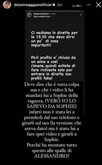 “Devo dire che è tutta colpa sua e che i video della ragazza (Luzma, ndr) li ha mandati lui a Sophie (vero, io l’ho saputo da Sophie). Infatti, non è stata lei a prenderli dal suo telefono e a girarli sul suo (la versione che aveva dato), ma è stato lui a fare quei video e a girarli a Sophie. Perché ha montato tutto questo alle spalle di Alessandro?”.