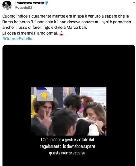“Quando sono rientrati dalla gita fuori porta sono apparsi alquanto strani. Massimiliano Varrese da ieri appare molto arrabbiato e si dichiara pronto a lasciare il reality appena gli autori diranno loro del prolungamento. Giuseppe Garibaldi da ieri sera non rivolge la parola ad Anita Olivieri. È chiarissimo che è successo qualcosa tra loro che ha ferito il bidello calabrese. Lei si chiede quale sia il motivo del suo atteggiamento perché lui finora non lo ha detto. Forse Giuseppe ha visto Anita distaccata da lui in un contesto di libertà. Gli inquilini in Casa hanno cominciato a usare i termini ‘paziente, ratto, bidello’ che sono utilizzati dagli haters di X (ex Twittr). Infine. Paolo Masella, quando ieri sera è rientrato in Casa, a Marco Maddaloni ha indicato con le dita il numero tre e il numero uno. Per chi segue il calcio questo è il risultato di una recente partita della Roma”.