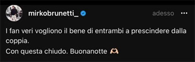 Intanto, nelle ultime ore, rispondendo ad una follower su Threads, Mirko Brunetti ha frenato nuovamente in merito ad un possibile ritorno di fiamma con Perla Vatiero: “I fan veri vogliono il bene a prescindere dalla coppia. Con questa chiudo. Buonanotte”.