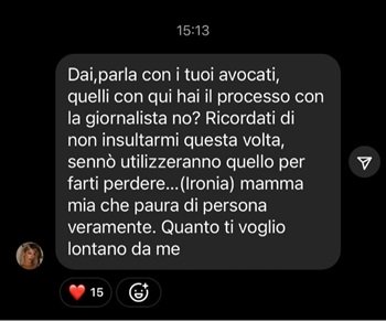 Non si è fatta attendere la replica della Marzoli: “Dai, parla con i tuoi avvocati, quelli con cui hai il processo con la giornalista (Selvaggia Lucarelli, ndr). Ricordati di non insultarmi questa volta, sennò utilizzeranno quello per farti perdere (ironia). Mamma mia che paura di persona veramente. Quanto ti voglio lontano da me”.