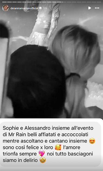 Ieri è arrivata la conferma definitiva del ritorno di fiamma dei Basciagoni. I due, infatti, sono stati visti insieme ad un evento di Mr. Rain. La segnalazione, con tanto di “prova” fotografica, è arrivata a Deianira Marzano: “Sophie e Alessandro insieme all’evento di Mr. Rain, belli, affiatati e accoccolati mentre ascoltano e cantano insieme. Sono così felice per loro. L’amore trionfa sempre. Noi tutti Basciagoni siamo in delirio”.