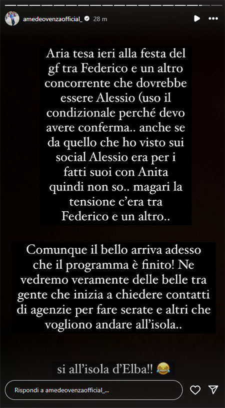 Nelle ultime ore, però, è emerso un retroscena su quanto accaduto al party degli ex gieffini. A svelarlo è stato Amedeo Venza tramite le sue Instagram stories: “Aria tesa ieri alla festa del GF tra Federico (Massaro, ndr) e un altro concorrente che dovrebbe essere Alessio (uso il condizionale perché devo avere conferma…), anche se, da quello che ho visto sui social, Alessio era per i fatti suoi con Anita, quindi non so… Magari la tensione c’era tra Federico e un altro”.