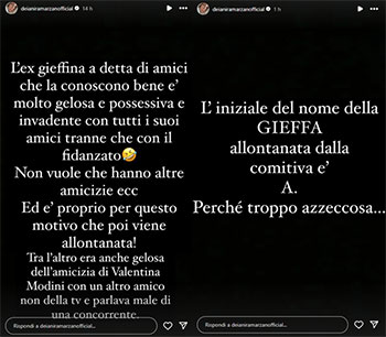 Nella giornata di ieri, Deianira Marzano, tra le sue Instagram stories, ha rivelato che una ex concorrente sia stata allontanata: “Dopo la fine del Grande Fratello, con una delle ex concorrenti si sono raffreddati i rapporti ed è stata messa da parte da altri gieffini perché la presenza era un po’ scomoda. Poverina, prima stava sempre in mezzo”.