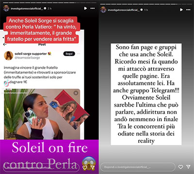 Sui social è scoppiato un vero e proprio putiferio. In molti hanno accusato l’ex gieffina di essere scorretta e di voler ingannare i suoi followers meno esperti. Tra questi, ci sarebbe anche Soleil Sorge, ex protagonista della sesta edizione del Grande Fratello Vip. Stando a quanto rivelato dall’Investigatore social Alessandro Rosica, l’ex vippona sarebbe “on fire contro Perla”. In realtà, non si tratterebbe esattamente di Soleil, ma di una sua nota fanpage su X, la quale, nel commentare una delle sponsorizzazioni della Vatiero, ha scritto: “Immagina vincere il Grande Fratello (immeritatamente) e ritrovarti a sponsorizzare delle truffe ai tuoi sostenitori solo per guadagnare un euro”. Ma Rosica è sicuro che si tratti della Sorge: “Sono fanpage e gruppi che usa anche Soleil. Ricordo mesi fa quando mi attaccò attraverso quelle pagine. Era assolutamente lei. Ha anche gruppo Telegram”.