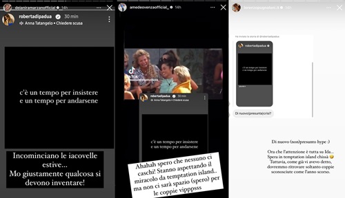 Nelle ultime ore, però, alcune mosse social di Roberta sembrerebbero aver messo nuovamente in discussione la solidità del rapporto con Alessandro. La Di Padua, infatti, ha pubblicato nelle sue Instagram stories una frase che in molti hanno ipotizzata si riferisca alla relazione con Vicinanza: “C’è un tempo per insistere e un tempo per andarsene”. La storia pubblicata dall’ex dama ha fatto il giro dei social, scatenando anche l’ironia di diversi esperti di gossip, tra cui Deianira Marzano, Amedeo Venza e Lorenzo Pugnaloni, secondo i quali le parole di Roberta sembrano essere solo un tentativo per attirare l’attenzione con l’obiettivo di partecipare alla prossima edizione di Temptation Island (ma dovrebbero prendervi parte solo coppie sconosciute).