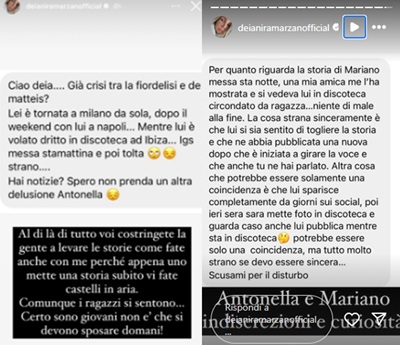 “Ciao Deia, già crisi tra la Fiordalisi e De Matteis? Lei è tornata a Milano da sola dopo il weekend a Napoli con lui. Mentre lui è volato dritto in discoteca ad Ibiza. Ha messo una storia su Instagram poi tolta, strano…”, ha scritto una seguace dell’esperta di gossip. Dopo poche ore è giunta una nuova segnalazione: “Per quanto riguarda la storia di Mariano messa questa notte, una mia amica me l’ha mostrata e si vedeva lui in discoteco circondato da una ragazza… niente di male alla fine. La cosa strana sinceramente è che lui si sia sentito di togliere la storia è che ne abbia pubblicata una nuova dopo che è iniziata a girare la voce e tu ne hai parlato. Altra cosa che potrebbe solamente essere una coincidenza è che lui sparisce completamente da giorni sui social, poi ieri sera mette foto in discoteca. Potrebbe essere solo una coincidenza, ma tutto molto strano se devo essere sincera”.