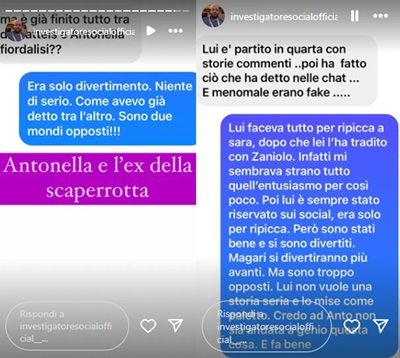 Rosica è stato molto più diretto: “Tutto finito tra Antonella Fiordelisi e Mariano De Matteis. Era solo divertimento, niente di serio. Come avevo già detto tra l’altro. Sono due mondi opposti […] Sono stati bene e si sono divertiti, magari si divertiranno più avanti. Ma sono troppo opposti. Lui non vuole una storia seria e lo mise come paletto. Credo che Anto non sia andata a genio questa cosa. E fa bene”.