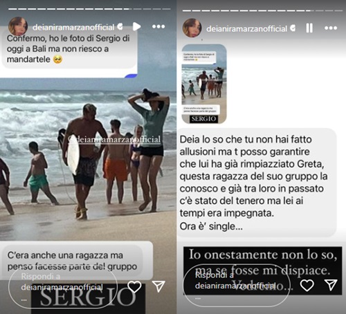 Tuttavia, nelle ultime ore, i fan della coppia hanno notato un dettaglio che lascerebbe ipotizzare che non è stata scritta la parola fine alla storia d’amore tra i due ex gieffini. Greta, infatti, segue nuovamente Sergio su Instagram. Tuttavia, rispondendo ad un utente che ipotizzava che la relazione tra i due non fosse finita (“Sergio è ritornato da Bali e spero che chiariscano”), Deianira Marzano ha replicato: “La storia è finita, punto. Sergio è rimasto a Bali”. Ed è proprio sull’isola indonesiana che D’Ottavi avrebbe già voltato pagina. O almeno è ciò che sostiene un utente che ha scritto alla Marzano: “Deia, lo so che tu non hai fatto allusioni, ma ti posso garantire che lui ha già rimpiazzato Greta. Questa ragazza del suo gruppo la conosco e tra loro in passato c’è stato del tenero, ma lei ai tempi era impegnata. Ora è single…”..