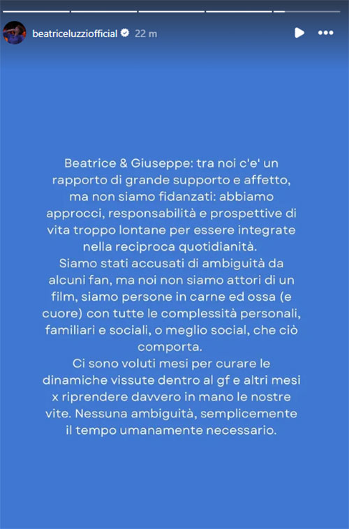 Nelle ultime ore, Beatrice Luzzi è tornata a parlare del suo rapporto con Giuseppe Garibaldi, facendo chiarezza una volta per tutte: “Tra noi c’è un rapporto di grande supporto e affetto, ma non siamo fidanzati: abbiamo approcci, responsabilità e prospettive di vita troppo lontane per essere integrate nella reciproca quotidianità. Siamo stati accusati di ambiguità da alcuni fan, ma noi non siamo attori di un film, siamo persone in carne ed ossa (e cuore) con tutte le complessità personali, familiari e sociali, o meglio social, che ciò comporta. Ci sono voluti mesi per curare le dinamiche vissute dentro al GF e altri mesi per riprendere davvero in mano le nostre vite. Nessuna ambiguità, semplicemente il tempo umanamente necessario”.