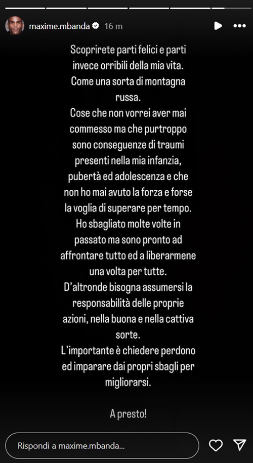 Al riguardo, Maxime ha rotto il silenzio attraverso una storia su Instagram, ammettendo gli sbagli commessi in passato: “Scoprirete parti felici e parti orribili della mia vita. Come una sorta di montagna russa. Cose che non vorrei aver commesso, ma che purtroppo sono conseguenze di traumi presenti nella mia infanzia, pubertà e adolescenza, e che non ho mai avuto la forza e forse la voglia di superare per tempo. Ho sbagliato molto volte in passato, ma sono pronto ad affrontare tutto e a liberarmene una volta per tutte. D’altronde, bisogna assumersi le responsabilità delle proprie azioni, nella buona e nella cattiva sorte. L’importante è chiedere perdono e imparare dai propri errori per migliorarsi”.