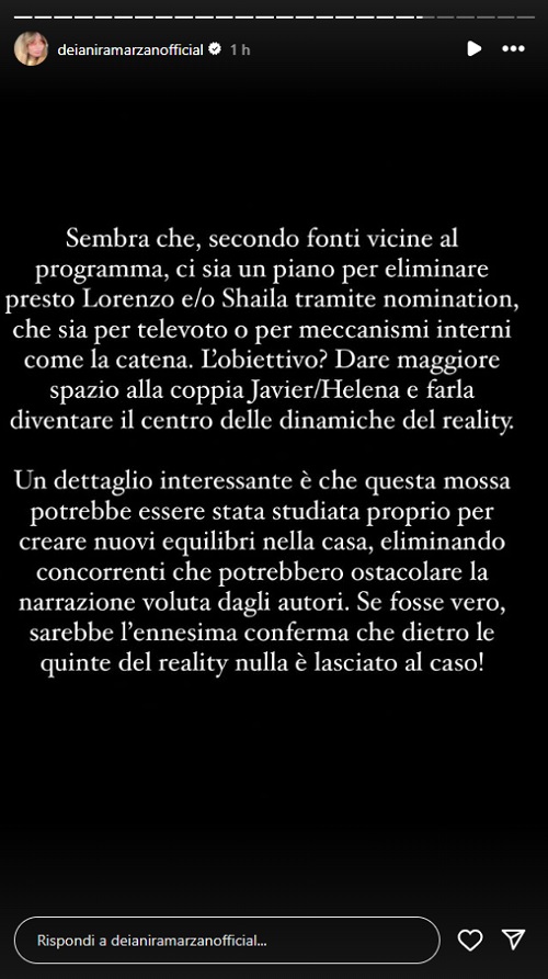 "Sembra che, secondo alcune fonti vicine al programma, ci sia un piano per eliminare presto Lorenzo e/o Shaila tramite Nomination, che sia per televoto o per meccanismi interni come la catena. L'obiettivo? Dare maggiore spazio alla coppia Javier-Helena e farla diventare il centro delle dinamiche del reality. Un dettaglio interessante è che questa mossa potrebbe essere stata studiata proprio per creare nuovi equilibri nella Casa, eliminando concorrenti che potrebbero ostacolare la narrazione voluta dagli autori. Se fosse vero, sarebbe l'ennesima conferma che dietro le quinte del reality nulla è lasciato al caso".