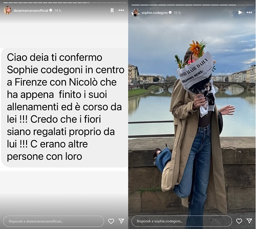 E’ di poche ore fa la segnalazione arrivata a Deianira Marzano relativa ad un avvistamento di Sophie e Nicolò a Firenze (dove la Codegoni si è recata per un evento): “Ciao Deia. Ti confermo Sophie Codegoni in centro a Firenze con Nicolò Fagioli che ha appena finito i suoi allenamenti ed è corso da lei […] C’erano altre persone con loro”. Sophie ha anche condiviso su Instagram una foto mentre tiene in mano un mazzo di fiori, che si ipotizza le possa essere stato donato dal calciatore.