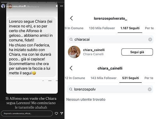 Intanto, nelle ultime ore è arrivata una nuova segnalazione, questa volta ad Amedeo Venza. Un utente gli ha scritto che Lorenzo Spolverato segue Chiara Cainelli su Instagram, mentre lei no. “So per certo che Alfonso è geloso… abbiamo amici in comune. Ha chiuso con Federica, ha iniziato subito con Chiara, ma con lei durerà poco, già si capisce. Scommettiamo che ora per salvare la faccia a lui mette il segui?”. “Sì, Alfonso non vuole che Chiara segua Lorenzo! Cominciano le tarantelle”, ha commentato l’esperto di gossip.