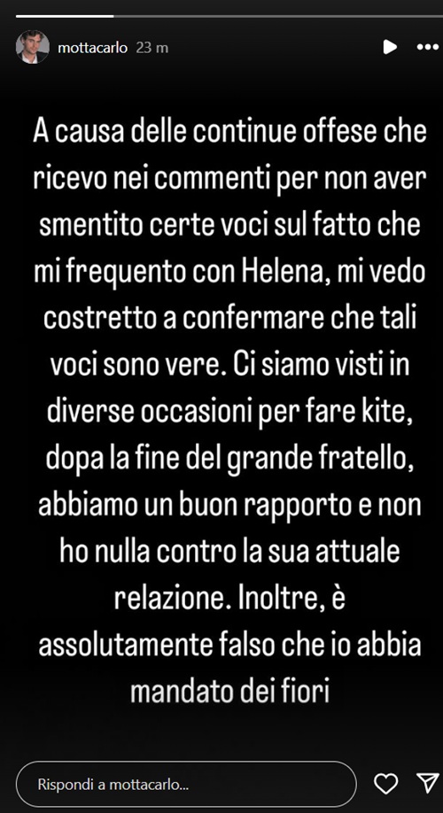 "A causa delle continue offese che ricevo nei commenti per non aver smentito certe voci sul fatto che mi frequento con Helena, mi vedo costretto a confermare che tali voci sono vere. Ci siamo visti in diverse occasioni per fare kite, dopo la fine del Grande Fratello, abbiamo un buon rapporto e non ho nulla contro la sua attuale relazione. Inoltre, è assolutamente falso che io abbia mandato dei fiori".