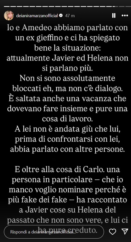 Nelle ultime ore, Deianira Marzano è intervenuta nuovamente sulla questione, rivelando che lei e il collega Amedeo Venza avrebbero saputo da un ex gieffino che Helena e Javier in questo momento non si parlerebbero: “Io e Amedeo abbiamo parlato con un ex gieffino e ci ha spiegato bene la situazione: attualmente Javier e Helena non si parlano più. Non si sono assolutamente bloccati eh, ma non c’è dialogo. E’ saltata anche una vacanza che dovevano fare insieme e pure una cosa di lavoro. A lei non è andata giù che lui, prima di confrontarsi con lei, abbia parlato con altre persone (si riferisce a D’Anelli, ndr). E oltre alla cosa di Carlo, una persona in particolare ha raccontato a Javiercose su Helena del passato che non sono vere, e lui ci ha pure creduto”.