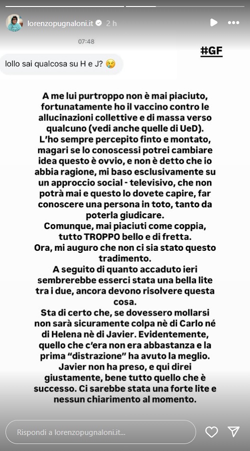 Adesso in molti si stanno chiedendo se Javier sapesse o meno degli incontri tra Helena e Carlo. Al riguardo, stando a quanto rivelato dal collega Lorenzo Pugnaloni, sembra dopo quanto accaduto ieri, la Prestes e Martinez avrebbero avuto una lite: “A seguito di quanto accaduto ieri, sembrerebbe esserci stata una bella lite tra i due, ancora devono risolvere questa cosa […] Javier non ha preso bene tutto quello che è successo. Ci sarebbe stata una forte lite e nessun chiarimento al momento”.