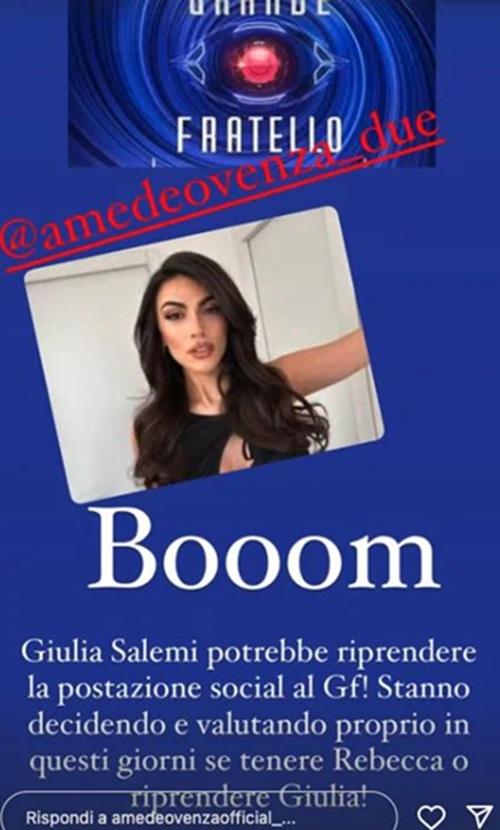 Stando a quanto rivelato da Amedeo Venza su Instagram, Giulia Salemi potrebbe tornare al Grande Fratello dopo due anni di lontananza dal reality. L'influencer potrebbe ricoprire ancora una volta il suo ruolo di "bastarda col tablet", così come ha fatto nel 2023. La compagna di Pierpaolo Pretelli, quindi, potrebbe prendere il posto di Rebecca Staffelli, che nell'ultima edizione si era occupata di leggere i commenti degli utenti su X scritti durante le puntate.