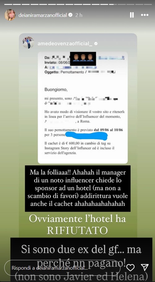 La prassi è pressoché la stessa: tramite l'agente, l'influencer di turno invia una mail chiedendo di usufruire gratis dei servizi in cambio di sponsorizzazioni sui propri account social. Ma adesso c’è stato un ulteriore upgrade. Amedeo Venza ha infatti pubblicato la mail dell’agente di un influencer che chiedeva non solo il pernottamento gratuito in un hotel per il suo assistito e per altre due persone “in cambio di tag su Instagram story”, ma anche il cachet di 600 euro per il proprio “talent”. “Ovviamente l’hotel ha rifiutato - ha scritto Deianira Marzano ricondividendo la story del collega -. Sono due ex del GF”.