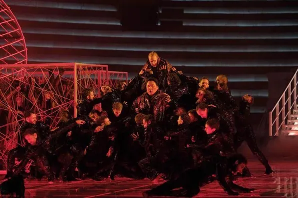 Lo spettacolo è attraversato da richiami potenti alla nostra epoca: la tensione fra modernità e memoria, fra autodistruzione e rinascita, prende forma attraverso simboli scenici e coreografie di massa, compreso un terribile e visionario fungo atomico. Tutto concorre a creare un universo parallelo, immersivo, a tratti ipnotico.