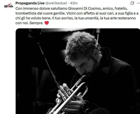 "Con immenso dolore salutiamo Giovanni Di Cosimo, il nostro amico, fratello, trombettista dal cuore gentile. Siamo vicini con tutto l’affetto possibile ai suoi cari, a sua figlia, agli amici e a tutti coloro che gli hanno voluto bene. Ciao Giovanni, il tuo sorriso, la tua umanità, la tua arte rimarranno con noi, sempre". Con queste parole, sul profilo Instagram di Propaganda Live, il programma di La7 annuncia la morte di Giovanni di Cosimo, a 61 anni, "lasciando un vuoto nel mondo della musica e tra i colleghi del programma, dove era una presenza costante e amata", si legge sul sito di La7. Una notizia che arriva dopo quella della scomparsa, a metà aprile, della violinista di 'Propaganda' Valentina del Re.