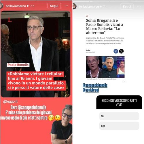 A quanto pare, però, né Sonia Bruganelli e né Paolo Bonolis avrebbero mantenuto la promessa. Lo ha lasciato intendere proprio Marco Bellavia su Instagram nella giornata di ieri condividendo alcuni post. Nel primo c’è Bonolis che dice: “Dobbiamo vietare i cellulari fino ai 16 anni, i giovani vivono in un mondo parallelo e si è perso il valore delle cose”, con un suo personale commento: “Caro Paolo Bonolis, è mica solo problema dei giovani. Tu invece usalo di più e fatti sentire”. Nel secondo, invece, Bellavia ha condiviso un vecchio articolo del 2022 dal titolo: “Sonia Bruganelli e Paolo Bonolis vicini a Marco Bellavia, lo aiuteremo!”, con tanto di provocazione diretta: “Secondo voi si sono fatti vivi?”.