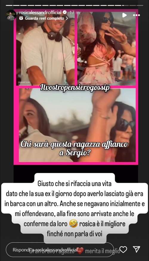 “Non mettete in mezzo terze persone che non c’entrano e con cui ci sono rapporti di amicizia normali, state sereni, poi se volete farvi film mentali siete liberi, ma io vi dico come stanno le cose e lo so io e lo sa Sergio. Sono una persona normale e non mi va di sbandierare la mia vita privata, condivido con voi la qualsiasi, ma ho sempre detto che la mia vita privata l’avrei lasciata tale. Ora non mi va di parlarne, non mi va di farvi sapere nulla. Quando avrò qualcosa da dire e se vorrò lo farò, adesso no. Ringrazio tutte le persone che mi hanno difeso e chiedo di seguire me se vi piace la mia persona, la mia vita privata continuerò a tenerla privata, come ho sempre fatto perché potremmo esserci lasciati dieci volte e voi non lo sapete. Se vorrò condividere qualcosa lo farò, fino ad allora voi non fatevi film mentali, vivete sereni, fatevi la vostra vita e amatemi”.