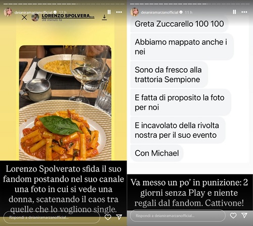 Ieri sera, però, Lorenzo ha scatenato il caos pubblicando sul suo canale broadcast una foto nella quale lo si vede a cena in compagnia di una donna. In seguito è arrivata una segnalazione a Deianira Marzano: “Greta Zuccarello. Abbiamo mappato anche i nei. La foto è fatta di proposito per noi. E’ incavolato dalla rivolta per il suo evento con Michael (Castorino, ndr)”.