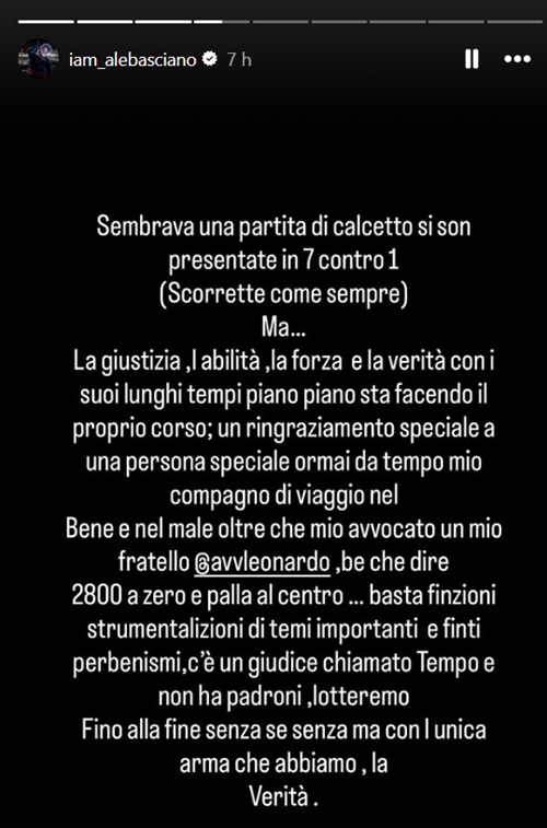 Alessandro Basciano non ha nascosto la sua soddisfazione. In una storia Instagram pubblicata subito dopo l’udienza, ha commentato con toni accesi e polemici: “Sembrava una partita di calcetto, si son presentate in 7 contro 1 (Scorrette come sempre). Ma… la giustizia, l’abilità, la forza e la verità con i suoi lunghi tempi piano piano sta facendo il proprio corso”.