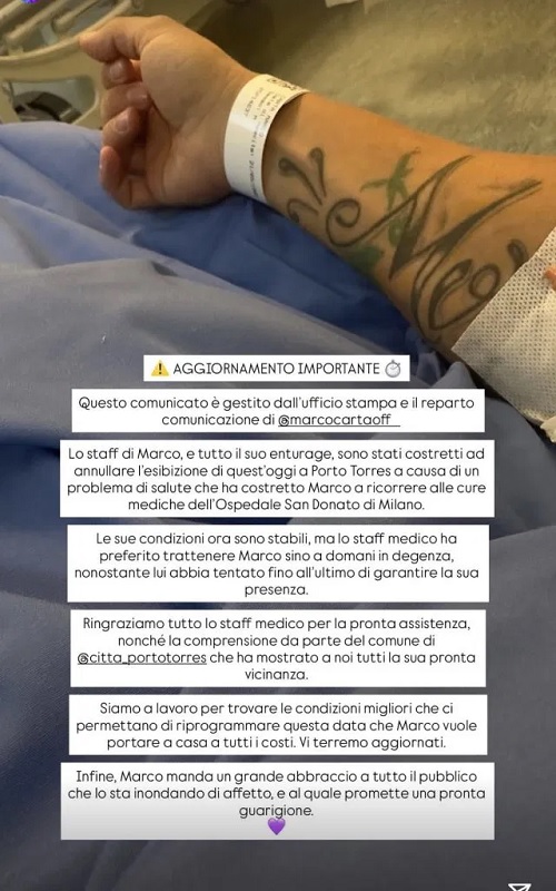 In mattinata, lo staff dell’artista aveva diffuso un comunicato ufficiale in cui si parlava di “ragioni inderogabili” che avevano costretto all’annullamento del concerto, senza però fornire ulteriori dettagli. Solo qualche ora più tardi è arrivata la notizia che ha fatto preoccupare i fan: Marco Carta aveva subito un malore e si trovava ricoverato presso l’Ospedale San Donato di Milano.