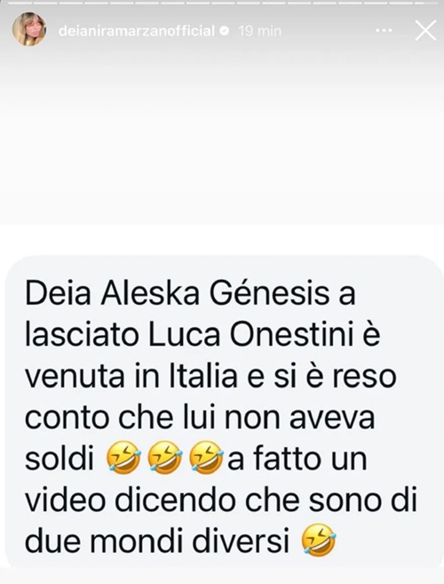 Tuttavia, secondo alcune segnalazioni arrivate a Deianira Marzano, sarebbe stata proprio Aleska a porre fine alla relazione. Diverse segnalazioni le avrebbero infatti confermato che la modella, una volta giunta in Italia per conoscere meglio la realtà di Luca, avrebbe cambiato idea sul futuro insieme a lui. Aleska ha condiviso un video in cui ha parlato di “differenze importanti” tra lei e Onestini, sottolineando come provengano da due mondi completamente diversi.
