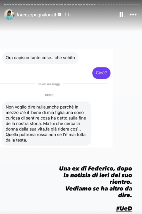 Ma neanche il tempo di sedersi nello studio, che già iniziano a circolare indiscrezioni. Una sua ex fidanzata – la cui identità è al momento sconosciuta – ha contattato Lorenzo Pugnaloni, commentando così il ritorno di Federico: “Non voglio dire nulla, anche perché in mezzo c’è il bene di mia figlia… ma sono curiosa di sentire cosa ha detto sulla fine della nostra storia. Ma lui che cerca la donna della sua vita, fa già ridere così. Quella poltrona rossa non se l’è mai tolta dalla testa”.