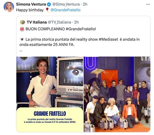 Simona Ventura è pronta a tornare in prima serata su Canale 5 alla guida della nuova edizione del Grande Fratello, al via lunedì 29 settembre. In attesa del debutto, la conduttrice ha celebrato sui social un traguardo importante per il celebre reality show: ieri, infatti, il Grande Fratello ha compiuto 25 anni.
