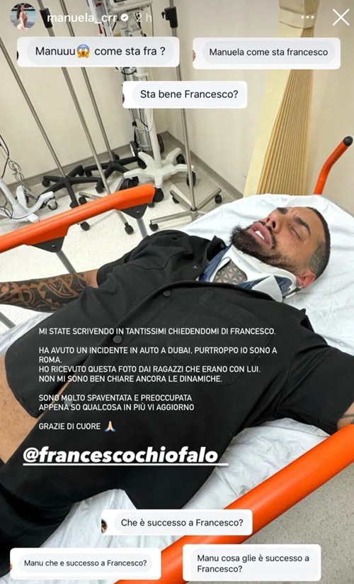 La fidanzata, Manuela Carriero, si trovava a Roma al momento dell’incidente e non ha potuto assistere Chiofalo di persona. Su Instagram ha condiviso una foto del fidanzato dopo l’incidente e ha spiegato: “Mi state scrivendo in tantissimi chiedendomi di Francesco. Ha avuto un incidente in auto a Dubai, purtroppo io sono a Roma. Ho ricevuto questa foto dai ragazzi che erano con lui. Non mi sono ben chiare ancora le dinamiche. Sono molto spaventata e preoccupata, appena so qualcosa in più vi aggiorno. Grazie di cuore”.