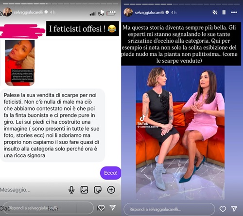 Ne sono seguite una serie di storie e video in cui Lucarelli sottolinea come, secondo lei, Balivo abbia più volte strizzato l’occhio al mondo dei feticisti dei piedi nel corso degli anni.