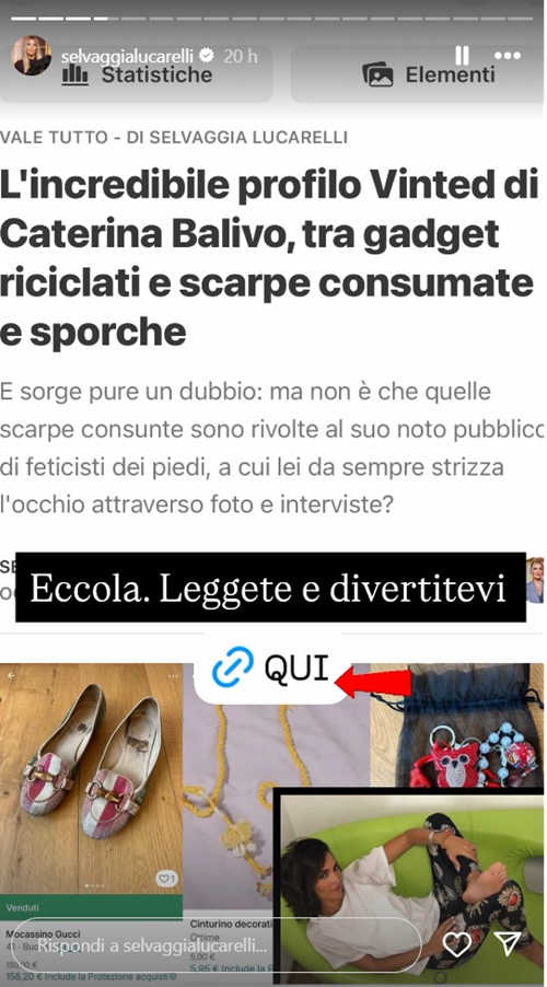 Il cuore della polemica riguarda un paio di scarpe Gucci, vendute a 150 euro, ormai consumate e sporche. Selvaggia Lucarelli si chiede perché una conduttrice milionaria decida di vendere oggetti in queste condizioni e suggerisce che potrebbe esserci un pubblico specifico a cui Balivo si rivolge: i feticisti dei piedi.