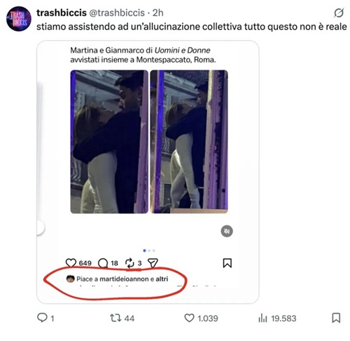 Non ci sono più tentennamenti. Martina e Gianmarco sono stati paparazzati mentre si baciavano all’esterno di un locale del quartiere Montespaccato di Roma, e anche se non è arrivata una dichiarazione formale, i gesti social parlano chiaro: Martina ha messo “mi piace” proprio alla foto di cui sopra, mentre Gianmarco ha iniziato a seguire una fanpage dedicata alla loro coppia.