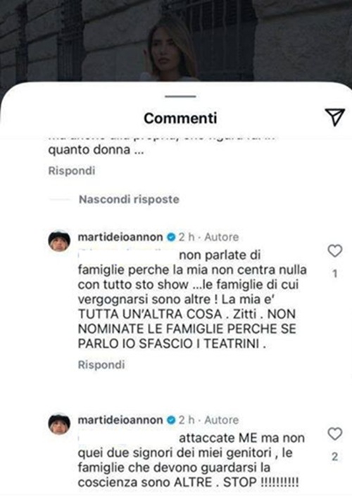 “Non parlate di famiglie perché la mia non c’entra nulla con tutto sto show. Le famiglie di cui vergognarsi sono altre! La mia è tutta un’altra cosa, zitti! Non nominate le famiglie perché se parlo io sfascio i teatrini. Attaccate me ma non quei due signori dei miei genitori, le famiglie che devono guardarsi la coscienza sono altre, Stop!”.